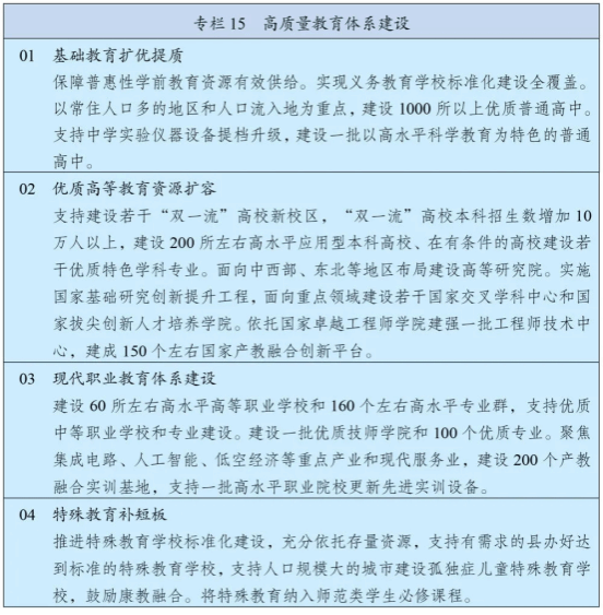 新华社受权于3月13日全文播发《中华人民共和国国民经济和社会发展第十五个五年规划纲要》。其中第三篇第十一章、第十一篇第三十八章集中阐述了教育的内容,具体如下: