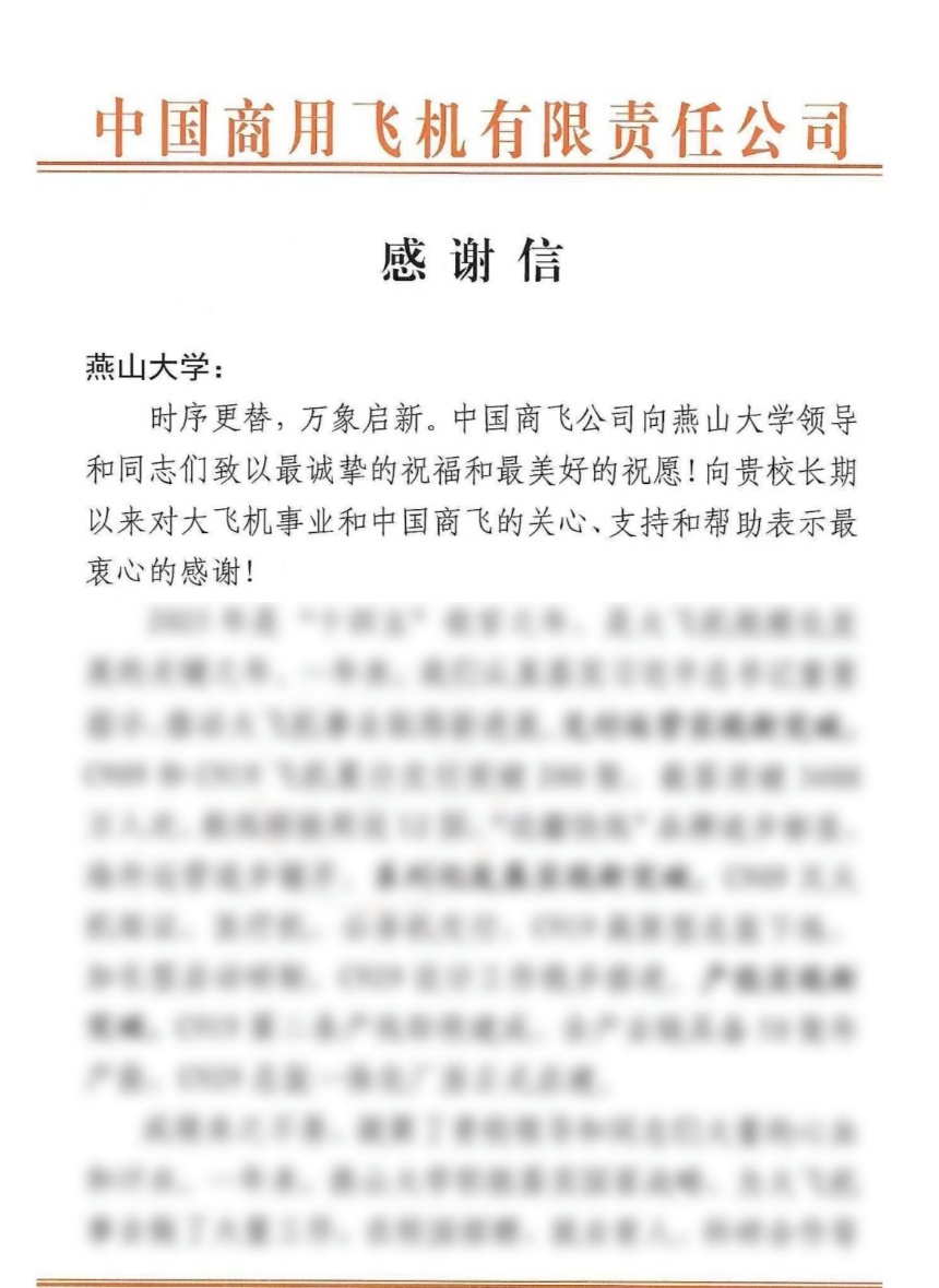 【新闻中心讯】近日,中国商用飞机有限责任公司(以下简称“中国商飞公司”)再次向燕山大学发来感谢信,对学校长期以来对国产大飞机事业和中国商飞的关心、支持和帮助,表示最衷心的感谢。