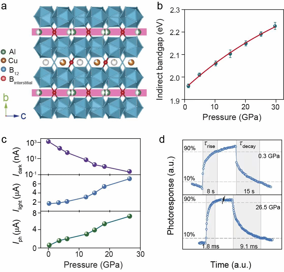 a,AlCu1–δB25的晶体结构模型;b, 压力下带隙变化;c, 压力下暗电流和光电流变化;d, 压力下光电响应变化