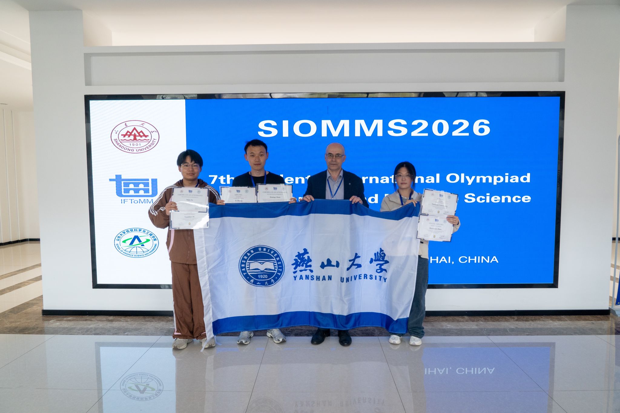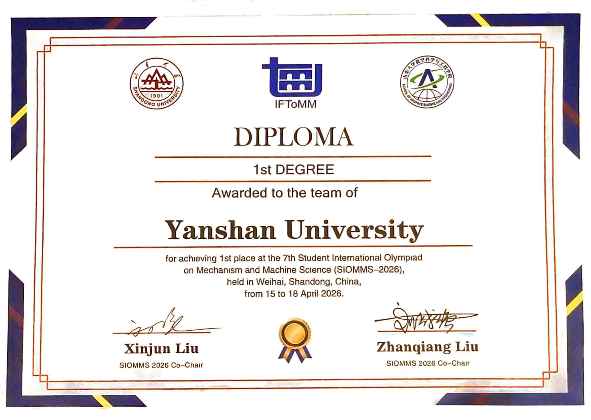 【新闻中心讯】4月15日至18日,第七届大学生国际机构与机器科学奥林匹克竞赛(SIOMMS 2026)在山东大学(威海)举办。燕山大学代表队凭借扎实的专业功底与出色的团队协作,与清华大学、天津大学包揽了本届大赛仅有的三个团队一等奖,创下我校在该项赛事中的历史性成绩。