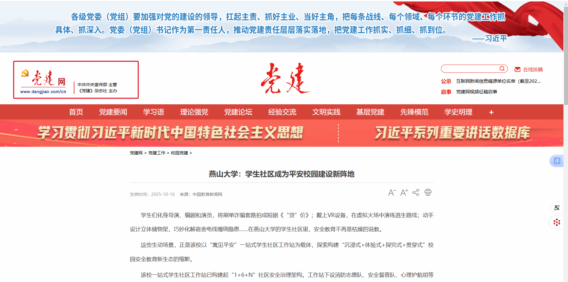 【新闻中心讯】近日,建筑工程与力学学院“寓见平安”一站式学生社区工作站在平安校园建设中的创新实践获得社会广泛关注,中国教育报、中国教育新闻网、党建网、河北教育发布等主流媒体纷纷以《燕山大学:学生社区成为平安校园建设新阵地》为题进行专题报道,其构建的安全教育生态与治理模式成为我校安全工作的特色亮点。