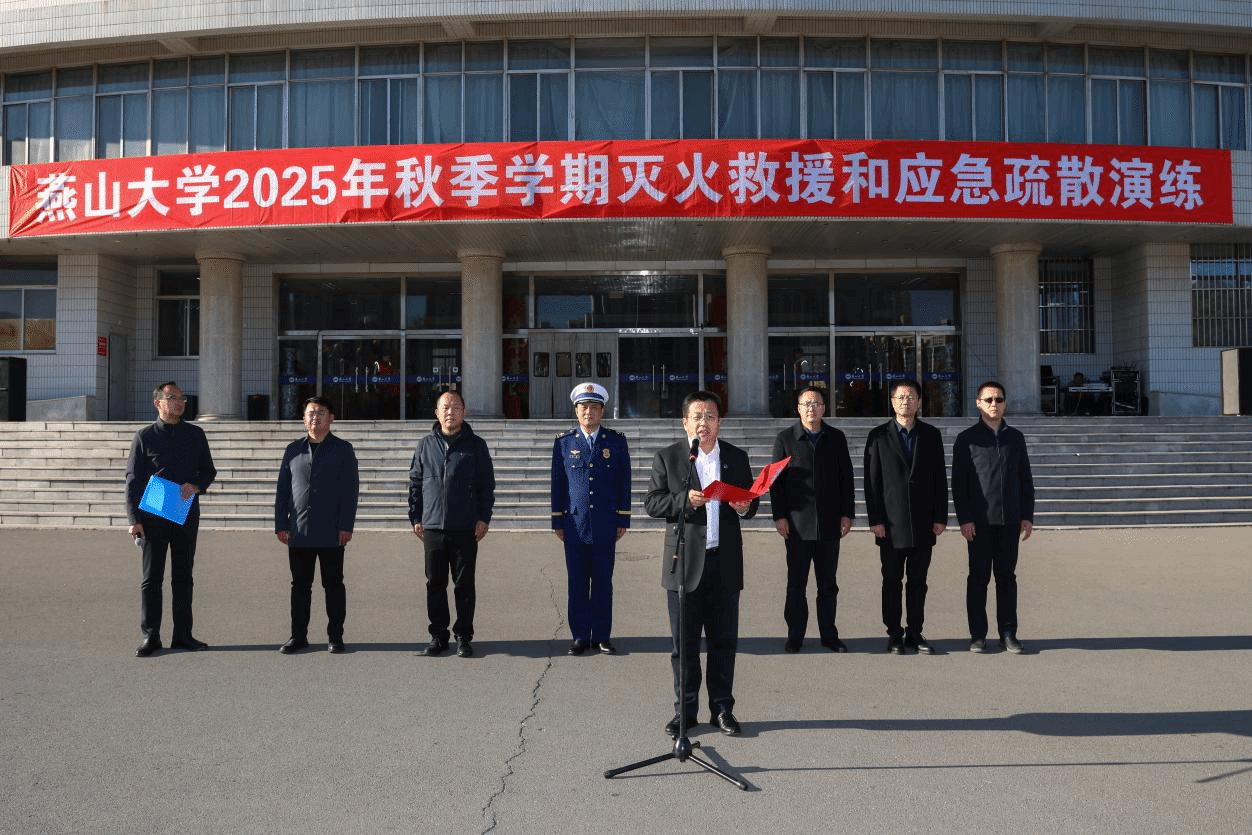 【新闻中心讯】11月13日下午,燕山大学联合秦皇岛市消防救援支队,在东校区图书馆举行2025年秋季学期灭火救援与应急疏散演练。学校党委副书记蔡星周出席并作动员讲话,秦皇岛市消防救援支队新闻宣传科科长薛松,以及学校学生工作处、信息技术中心、期刊社、档案馆、后勤服务中心、东北亚古丝路文明博物馆、出版社等部门、师生代表共1000余人参加演练和观摩。活动由安全工作处处长陈徽主持。