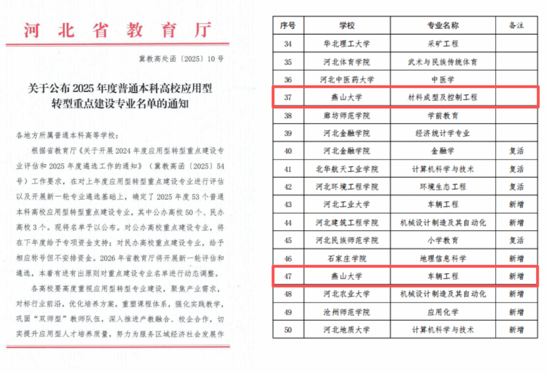 【新闻中心讯】近日,河北省教育厅发布了《关于公布2025年度普通本科高校应用型转型重点建设专业名单的通知》(冀教高处函〔2025〕10号),我校机械工程学院材料成型及控制工程专业和车辆与能源学院车辆工程专业,凭借鲜明的应用型办学特色、扎实的学科基础、优质的人才培养质量及深度的产教融合成果,分别顺利通过2025年度应用型转型重点建设专业年度评估和2025年度应用型转型重点建设专业遴选增补,成功进入2025年度河北省应用型转型重点建设专业行列。