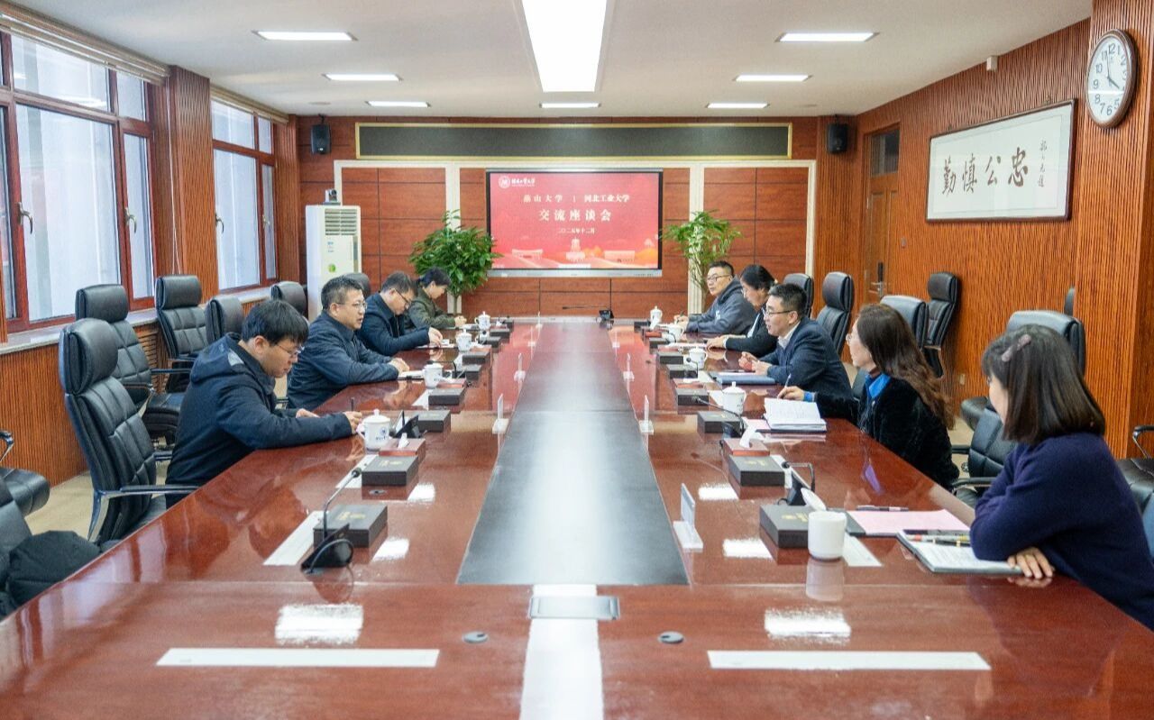 王利民对蔡星周一行表示热烈欢迎。他表示,燕山大学与河北工业大学在办学规模、学科布局、师资结构、校园文化等方面具有高度相似性,同时在学科历史传承与国际化发展等方面又各具特色。两校优势互补潜力显著,应进一步加强交流合作,实现共同发展与提升。蔡星周对河北工业大学的热情接待表示感谢,并赞赏河北工业大学在学科历史传承、学术梯队建设及精神文明建设等方面取得的优异成绩。他希望两校今后持续深化合作,聚焦思政育人、宣传创新等领域,促进资源共享与优势互补,共同为河北省高等教育高质量发展贡献力量。