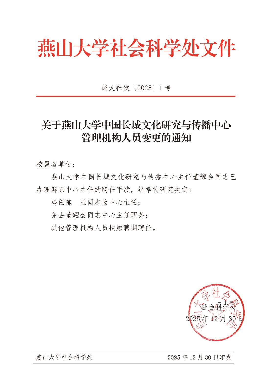 关于燕山大学中国长城文化研究与传播中心管理机构人员变更的通知