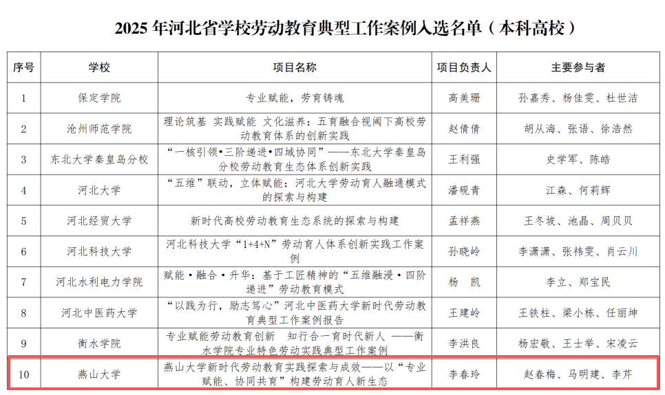 【燕山大学】近日,我校劳动教育典型工作案例《燕山大学新时代劳动教育实践探索与成效——以“专业赋能、协同共育”构建劳动育人新生态》成功入选2025年河北省劳动教育典型工作案例。