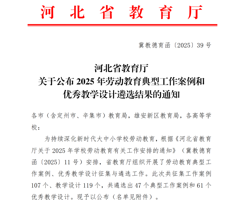 为持续深化新时代大中小学校劳动教育,落实立德树人根本任务,河北省教育厅组织开展了全省劳动教育典型工作案例、劳动教育优秀教学设计征集与遴选工作。据悉,此次活动共征集到工作案例107个、教学设计119个。经综合评议,全省共遴选出47个典型工作案例和61个优秀教学设计。我校入选的案例立足新时代劳动教育发展要求,联动宣传部、工会、学生工作处、后勤管理处等校内多部门协同推进,紧扣“专业赋能、协同共育”核心理念,系统梳理了学校在劳动教育实践中的探索路径与成效。