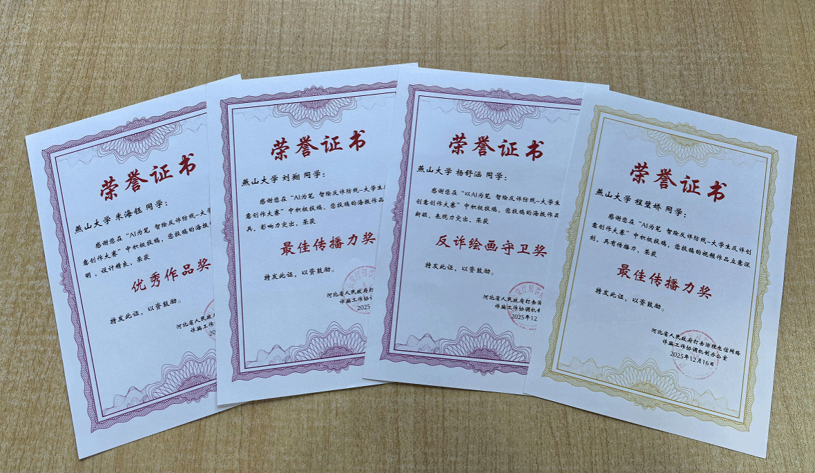 【新闻中心讯】近日,由河北省公安厅、河北省教育厅、中国人民银行河北省分行联合主办的“以AI为笔,智绘反诈防线——大学生反诈创意创作大赛”圆满落幕。燕山大学积极组织学生参赛,共有54件优秀作品从校内选拔中脱颖而出,入围省级评选,其中4件作品最终斩获多个奖项,展现了燕大学子出色的创新能力和反诈宣传责任感。