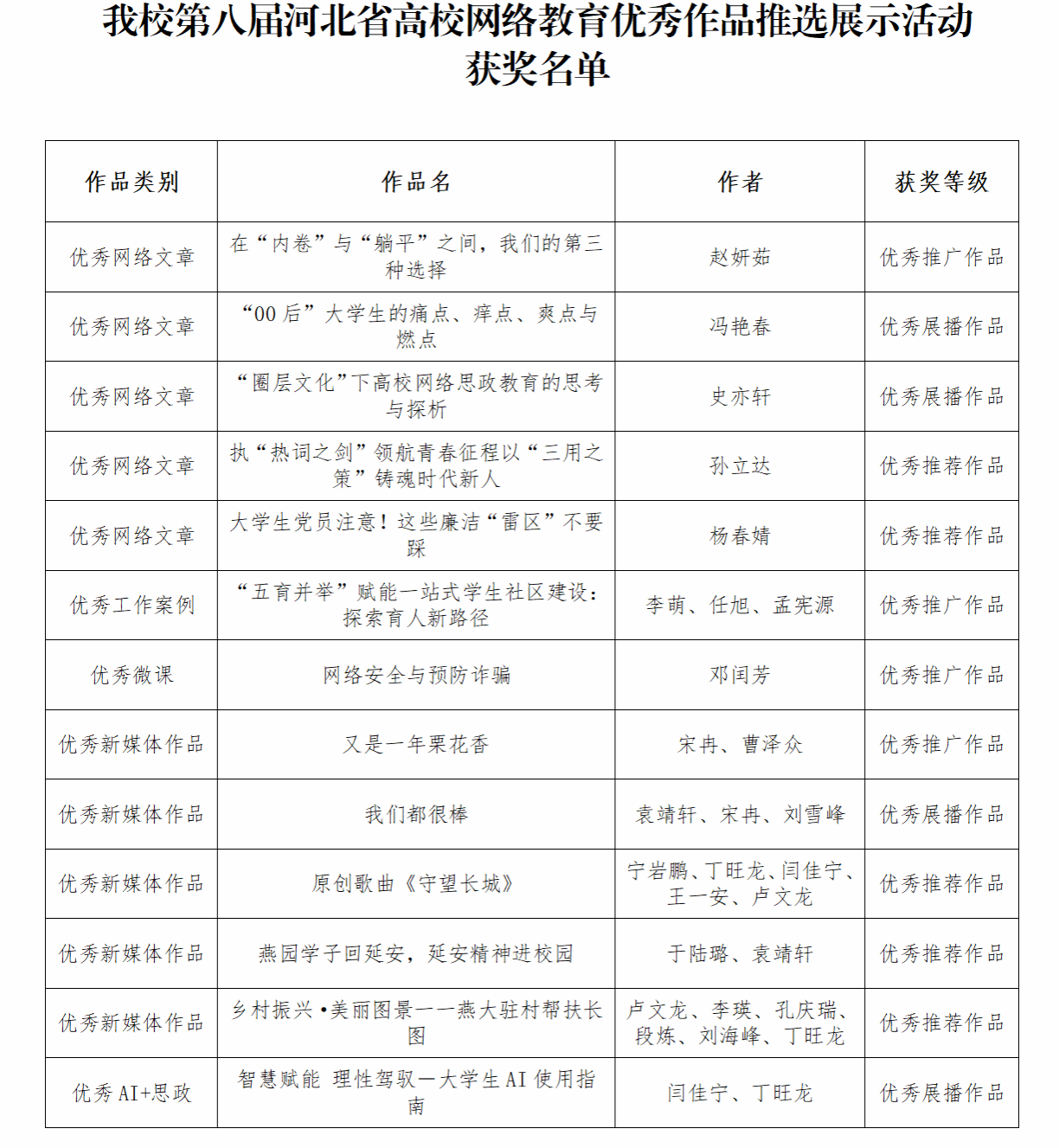 我校对此项活动高度重视,由学生工作处联合校易班发展研究中心牵头组织实施,通过明确活动导向、广泛动员宣传,在校级遴选阶段累计征集作品660余项。在此基础上,学校严格筛选、优中选优,推荐优秀作品参评省级赛事,最终斩获佳绩。未来,我校将锚定目标、精准施策,持续创作供给优质网络文化作品,着力打造“创作-共享-传播”三维融合的网络文化平台,切实提升网络思政工作的传播力、引导力、影响力和公信力。(编辑 王艳)