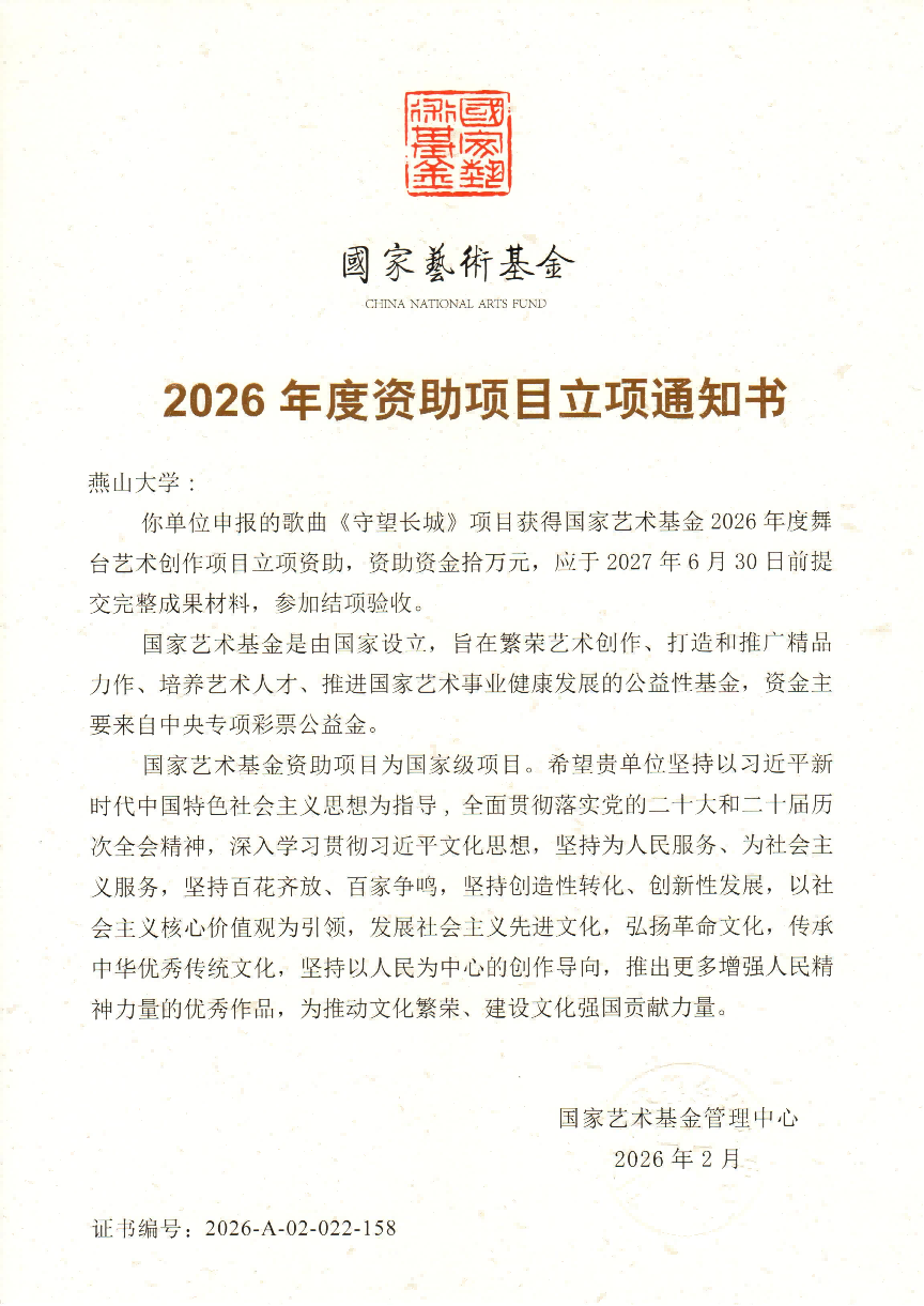 【新闻中心讯】近日,国家艺术基金管理中心公布了国家艺术基金2026年度资助项目立项结果,我院宁岩鹏老师申报的歌曲《守望长城》获批国家艺术基金2026年度舞台艺术创作资助项目。这是我院在高层次艺术创作项目立项方面取得的又一重要成果,充分体现了学院在艺术创作、科研创新和文化建设等方面不断提升的综合实力,也为学院高质量发展再添新成绩。