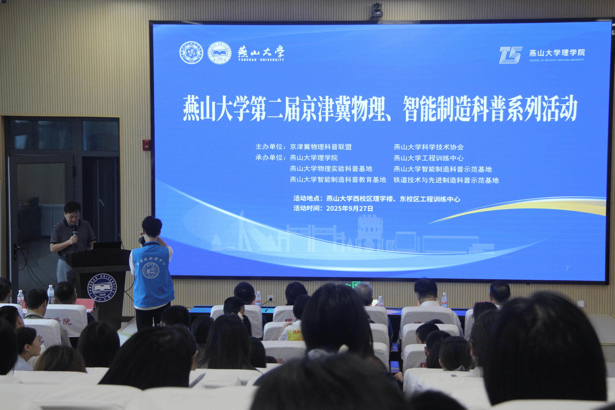 【新闻中心讯】9月27日,燕山大学举办第二届京津冀物理、智能制造科普系列活动。本次活动由京津冀物理科普联盟与燕山大学科学技术协会联合主办,燕山大学理学院、工程训练中心等单位共同承办,包含启动仪式、科普志愿者聘任、科普讲座、科普成果展、科普体验、科普基地开放等环节,系列活动在燕山大学东西校区相关场馆同步进行。