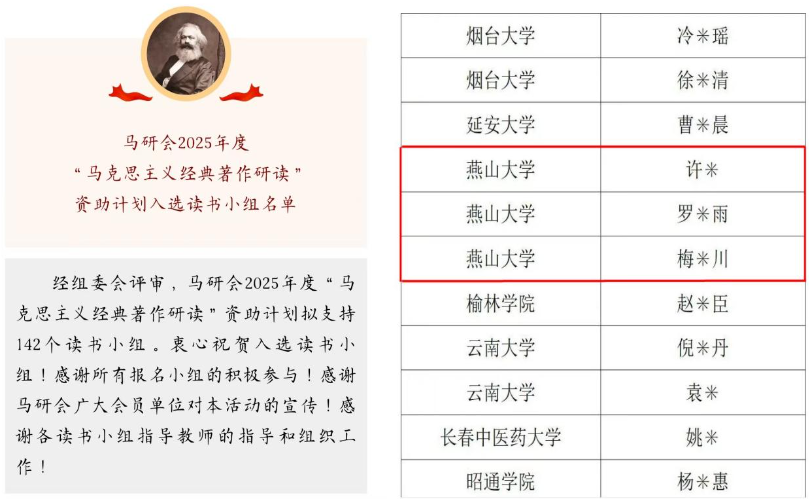 【新闻中心讯】经“马克思主义经典著作研读”组委会评审,中国高等教育学会马克思主义研究分会发布了2025年度“马克思主义经典著作研读”资助计划入选小组名单。在本次评审中,马克思主义学院“循理拾遗思享组”读书小组、“五峰山上一盏灯”读书小组以及“灯塔”读书小组成功入选资助计划,这是我院首次3个读书小组同时入选。据了解,全国共有142个读书小组入选本年度资助计划,其中,我校是同时入选3个读书小组的2所地方院校之一。