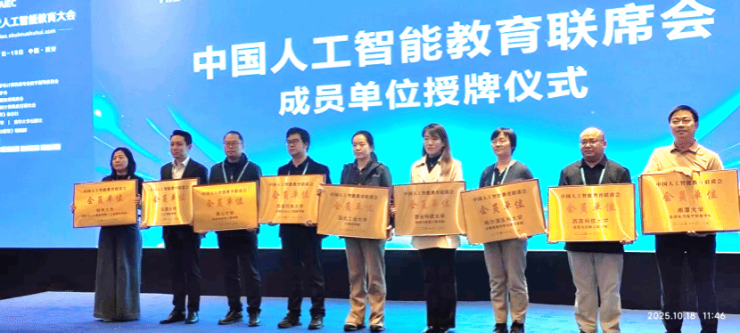 【新闻中心讯】10月18日,2025全国高校人工智能教育大会(AIEC 2025)在陕西省西安市成功举办。会议由教育部高等学校计算机类专业教学指导委员会、中国人工智能教育联席会等联合主办,西安交通大学承办,汇聚了郑南宁、郑庆华等多位院士及全国高校人工智能领域的专家学者,围绕人工智能人才培养、专业培养体系建设、专业课程设置、人工智能领域“101”计划、产教融合等热点话题展开深度交流。我校信息科学与工程学院入选“中国人工智能教育联席会”会员单位,计算机科学与工程系主任吴培良参加授牌仪式。