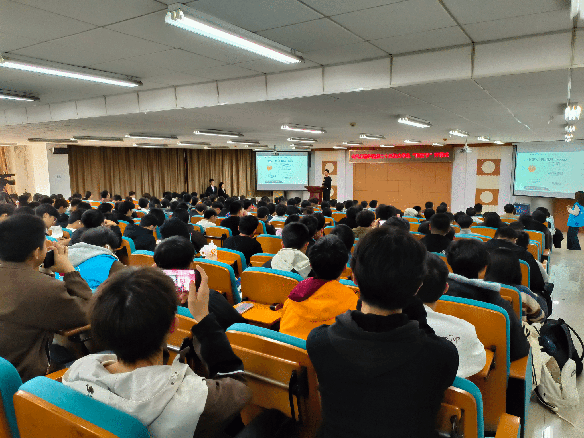 科技节在院长郭小强宣布“电气工程学院第二十三届科技节正式开幕”声中正式拉开帷幕。郭院长以优秀毕业生为例,鼓励同学们夯实专业基础,勇于创新实践。他指出,这些校友的成长轨迹充分证明,个人的发展只有与国家和时代的需求同频共振,才能绽放最耀眼的光彩。 他勉励在场同学,要珍惜科技节这个展示自我、锻炼能力的平台,将课堂所学与动手实践相结合,敢于奇思妙想,勇于挑战前沿,努力成长为推动科技进步和社会发展的栋梁之才。随后,在国家级科研竞赛中斩获大奖的两位科协代表以亲身经历分享相关经验,引导同学们积极参与到“科技节”各项活动中。