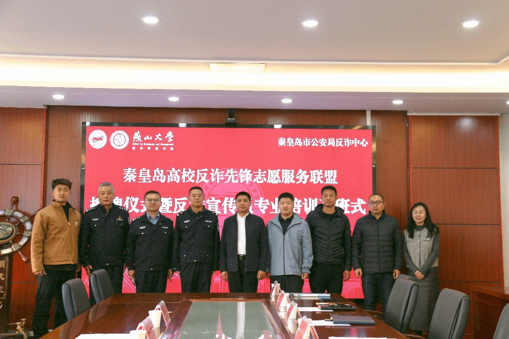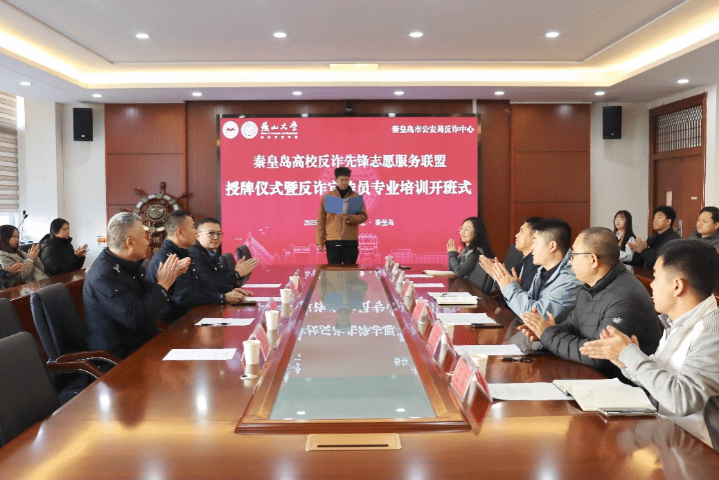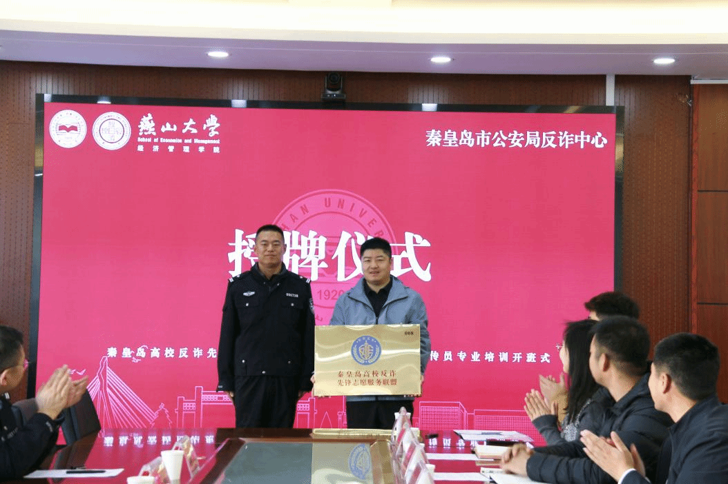 【新闻中心讯】11月20日9:00,燕山大学经济管理学院举办“秦皇岛高校反诈先锋志愿服务联盟”授牌仪式暨反诈宣传员培训开班式,秦皇岛市公安局反诈中心主任张云峰、海港分局燕园派出所副所长鲁亮、秦皇岛高校反诈先锋志愿服务联盟发起人王宝军、经济管理学院党委书记孙红磊、党委副书记王海涛、团委书记李宁等出席仪式,校人民武装部、安全工作处、经济管理学院辅导员和学生代表参加仪式。