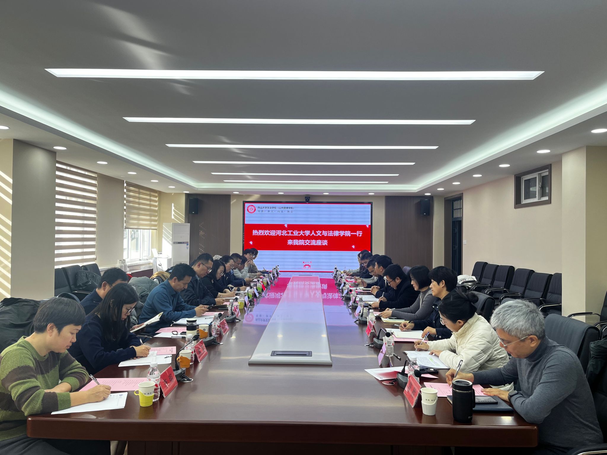 【新闻中心讯】11月25日,河北工业大学人文与法律学院党委书记于慧、院长蒋冰晶带队到访文法学院(公共管理学院)。上午召开的座谈会由文法学院(公共管理学院)党委书记杨健民主持,副院长郑志峰、王春城,党委副书记张玉华,副处级专职辅导员、学院工会主席徐进以及学院相关部门、各系负责人和教师代表参加座谈。