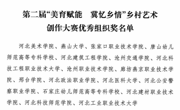 【新闻中心讯】近日,从河北省第二届“美育赋能 冀忆乡情”乡村艺术创作大赛传来喜讯,燕山大学师生创作团队凭借卓越的创意设计与深厚的乡土情怀,在众多参赛队伍中脱颖而出,荣获一等奖1项、二等奖2项,刘维尚、王一帆、姚远、马巨海、李冬5位老师荣获“优秀指导教师奖”,我校荣获大赛“优秀组织奖”。