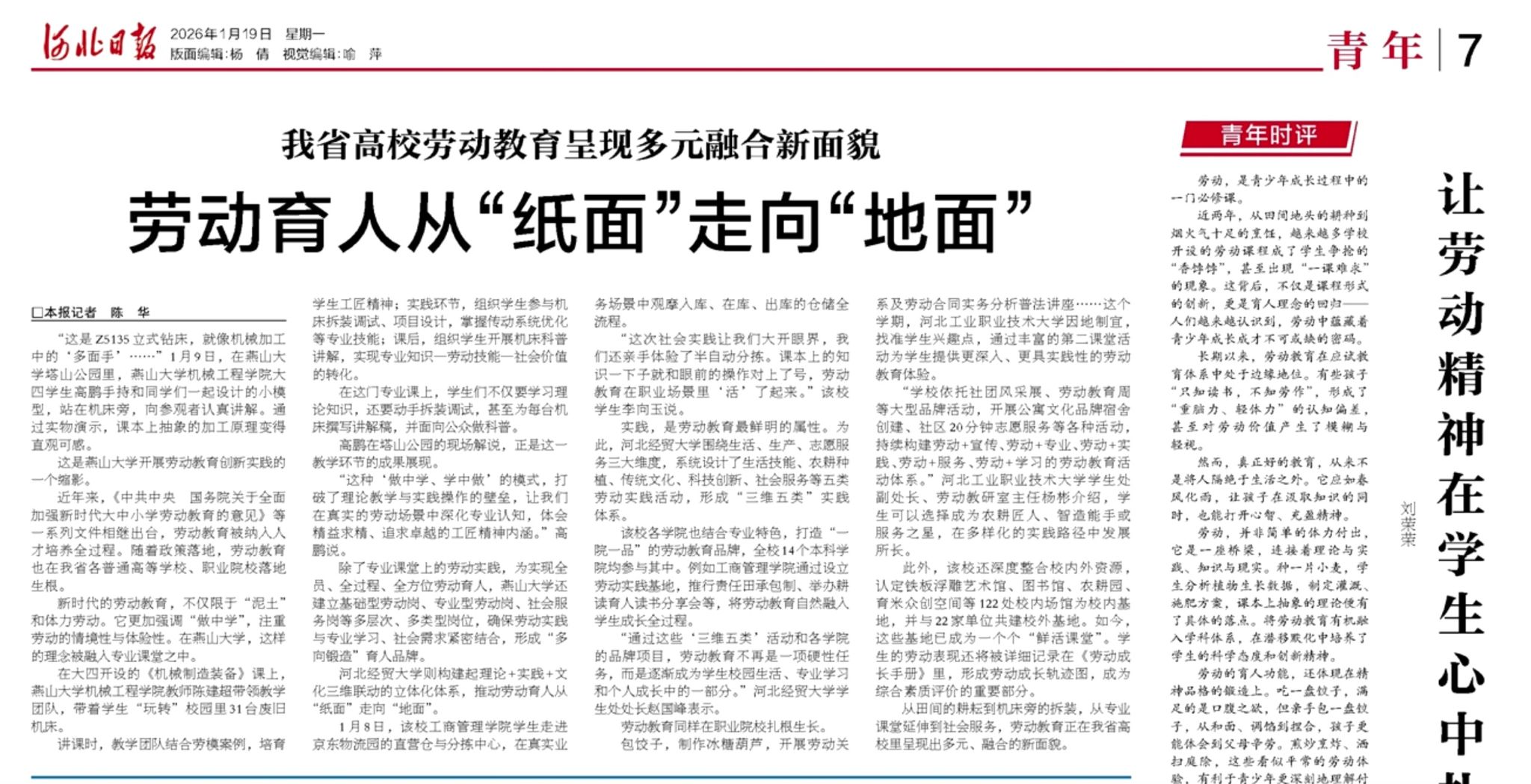 此次获《河北日报》报道,是我校持续深化教育教学改革、积极探索“多向锻造”育人路径的生动体现。学校将以此为契机,进一步融合“专业+”育人模式与“多向锻造”培养理念,拓展劳动教育的平台载体与精神内涵,引导学生在公益服务与社会实践中锤炼过硬本领、砥砺奉献精神。未来,我校将继续推动劳动教育向纵深发展,构建多渠道、多维度、多场景的实践育人体系,努力培养更多专业基础扎实、实践能力突出、兼具家国情怀与社会责任感的高素质工程人才。(编辑 王艳)