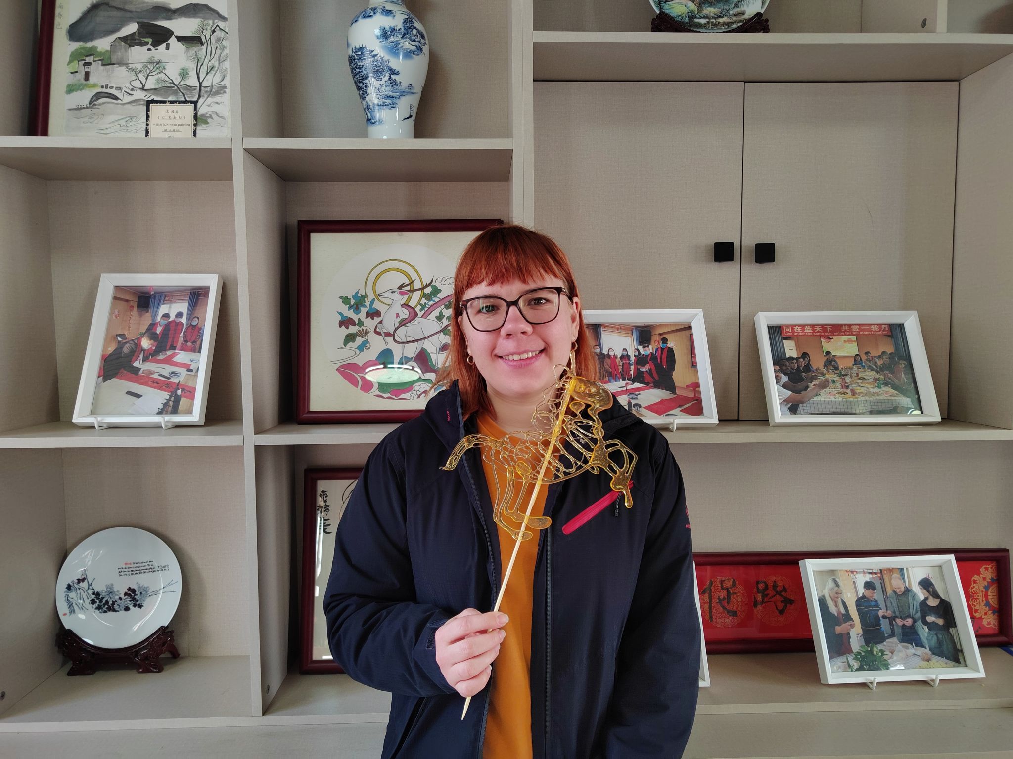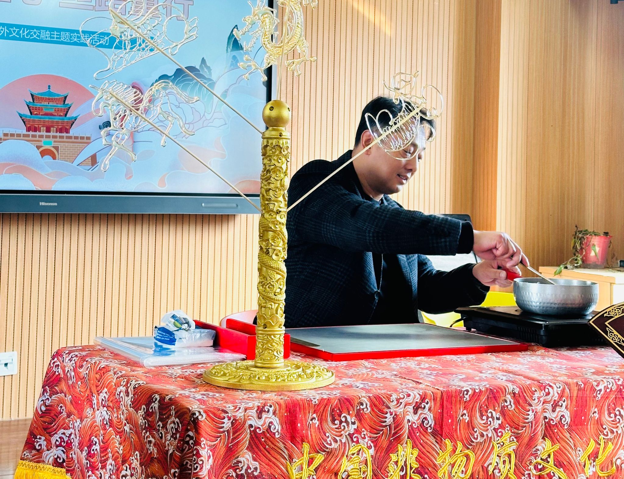活动在“巧手绘糖人”非遗体验课程中拉开帷幕。非遗糖画传承人于广奎现场演示了糖人制作流程,他依次完成非遗糖画的熬糖、勾勒、定型等步骤,快速呈现出形态规整的艺术作品。演示过程中,于广奎同步讲解了糖画的历史发展脉络及背后的文化内涵,参与本次活动的国际学生们与辖区儿童全程专注观看,并亲自参与糖画浇铸操作,共同感受非遗技艺的魅力,推动非遗文化在互动中传递。