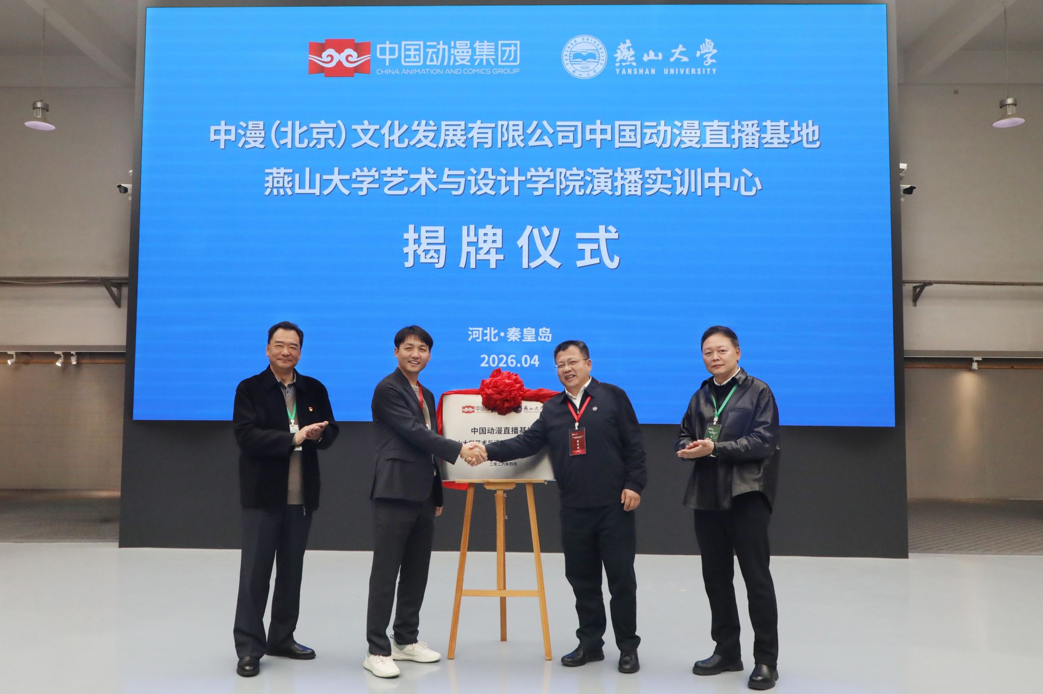 【新闻中心讯】在国家数字文化战略背景下,以“产教融合、艺工结合”为核心,促进艺术与设计类高质量人才培养与就业,4月16日上午,燕山大学党委副书记蔡星周与中国动漫集团中漫(北京)文化发展有限公司总经理邱军,共同为校企共建的演播实训中心揭牌。此次合作是深化产教融合的重要举措,为广大学子搭建了动漫直播领域实战实训平台,打通了高校人才培养与产业前沿需求的精准对接通道。