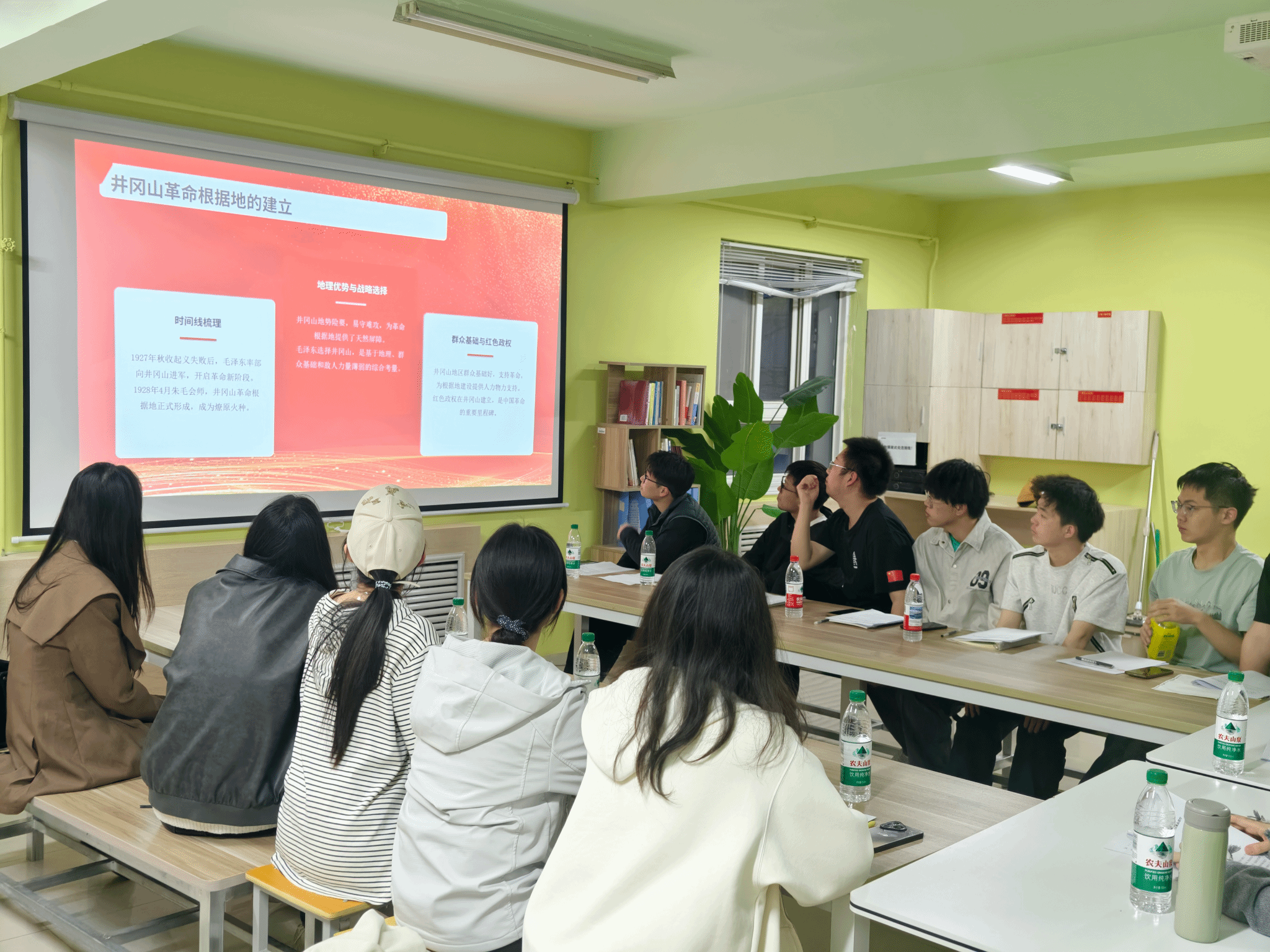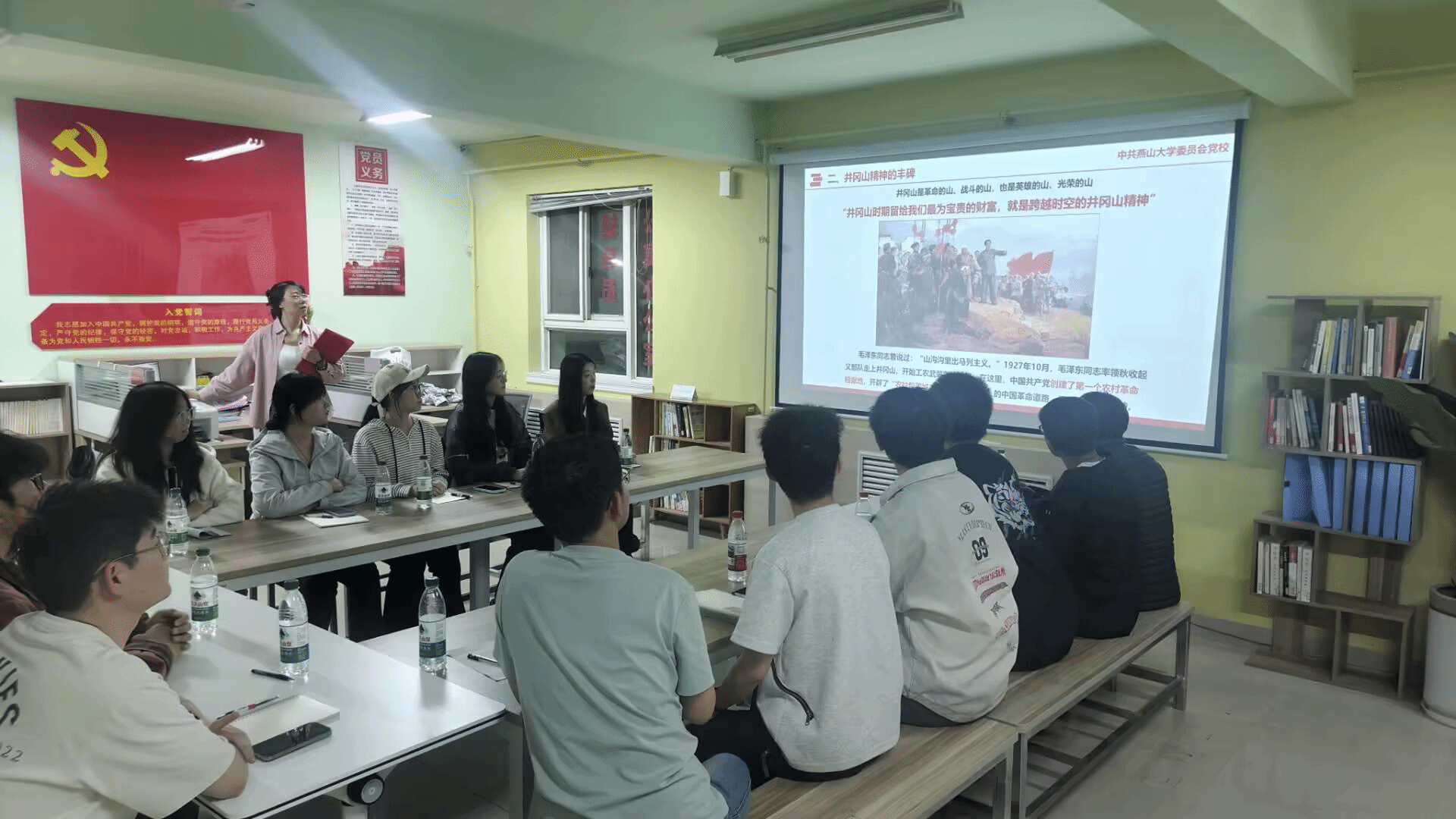 当同学们从紧张激烈的剧情中回到现实,内心仍激荡着对革命先辈的崇敬之情时,活动转入下半场的理论学习环节,本科生第一党支部书记赵雨桐讲授《跨越时空的井冈山精神》微党课。她结合刚刚结束的剧本杀体验,将大家带回到那段“星星之火,可以燎原”的峥嵘岁月,通过生动的史料和深入浅出的讲解,系统阐述了“坚定执着追理想、实事求是闯新路、艰苦奋斗攻难关、依靠群众求胜利” 的井冈山精神核心内涵。她提示全体同学,要将在红色剧本杀中感受到的勇气与智慧,转化为传承“井冈山精神”的实际行动,在专业学习和社会实践中发扬艰苦奋斗的优良作风。