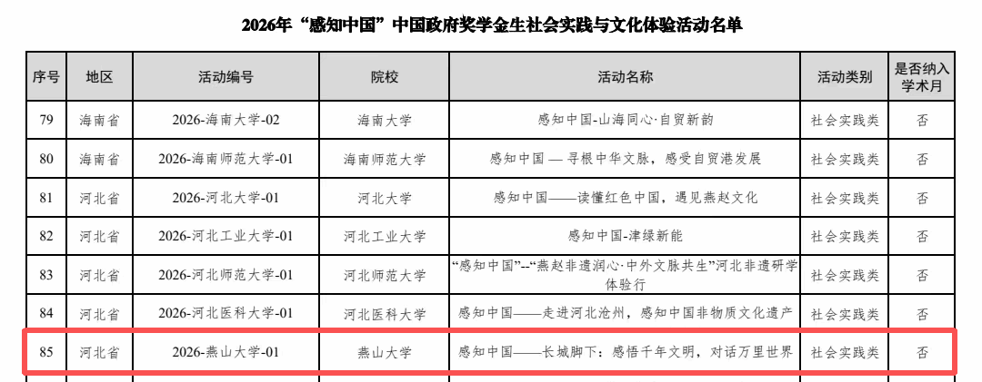 我校申报的“感知中国——长城脚下:感悟千年文明,对话万里世界”项目,历经学院申报、学校推荐、专家评审等环节,凭借科学完备的活动方案、特色鲜明的文化传播理念,成功获批 2026年“感知中国”中国政府奖学金生社会实践与文化体验活动。