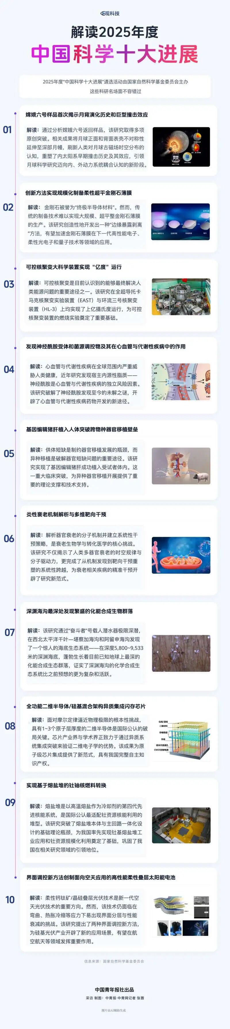 2026年3月25日,国家自然科学基金委员会党组书记、主任窦贤康在2026中关村论坛年会开幕式上发布了2025年度“中国科学十大进展”。它们分别是:嫦娥六号样品首次揭示月背演化历史和巨型撞击效应、创新方法实现规模化制备柔性超平金刚石薄膜、可控核聚变大科学装置实现“亿度”运行、发现神经酰胺受体和菌源调控物及其在心血管与代谢性疾病中的作用、基因编辑猪肝植入人体突破跨物种器官移植壁垒、炎性衰老机制解析与多维靶向干预、深渊海沟最深处发现繁盛的化能合成生物群落、全功能二维半导体/硅基混合架构异质集成闪存芯片、实现基于熔盐堆的钍铀核燃料转换、界面调控新方法创制面向空天应用的高性能柔性叠层太阳能电池。
