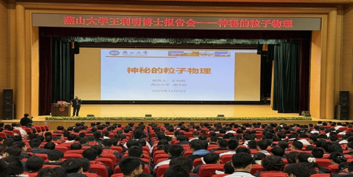 在中学,华长春一行与中学党委书记熊朝阳、副校长佘念利等开展座谈交流。华长春高度赞扬唐山一中在历史传统、人才培养、学科竞赛领域的显著成绩。他强调,燕山大学作为河北省重点骨干大学,在工科领域具有鲜明特色和优势,希望通过与唐山一中的深度合作,共同探索基础教育与高等教育的有效衔接机制。双方商定,要在现有基础上深化两校更高水平交流合作,相互支持,促进共同发展。理学院教师王利明面向高中师生开展了题为《神秘的粒子物理》的科普讲座。讲座深入浅出地介绍了粒子物理的基本概念、研究方法和前沿进展,通过生动的案例和形象的比喻,让同学们领略了微观世界的奥秘。