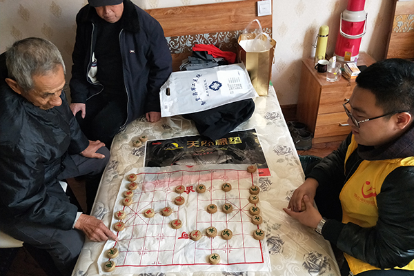 到达养老中心后,志愿者们作简单的自我介绍后,首先来到老人们的房间里,询问了老人们的生活情况,并送上亲切的问候和祝福。随后,他们陪老人们下象棋、听京剧,一位84岁的爷爷长期没有棋友,看到会下棋的志愿者十分开心。还有的学生和老人们拉家常、讲笑话,讲养生小知识,公寓内其乐融融,整个敬老院洋溢着温馨、祥和的气氛,看到老人们灿烂的笑容,听到老人们爽朗的笑声,同学们充分体会到了本次志愿活动的意义所在——弘扬志愿精神,关注老年群体。